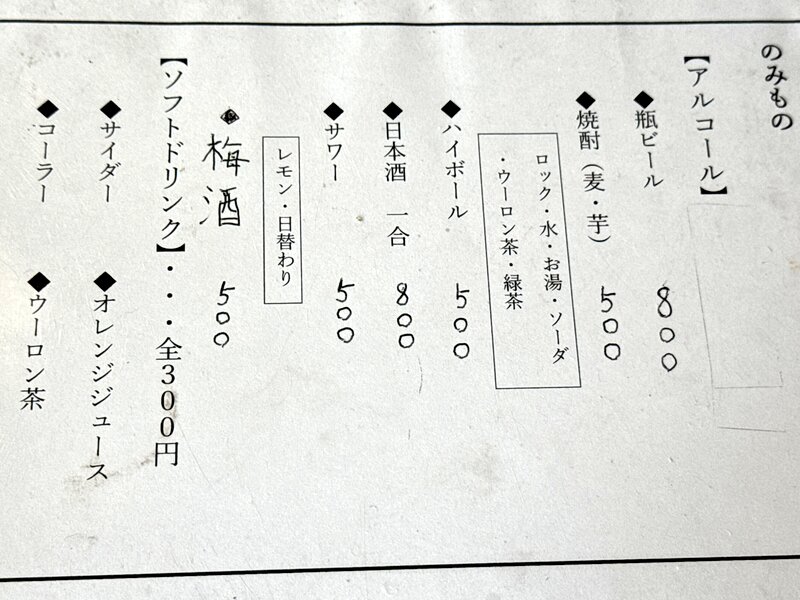 ドリンクメニュー。