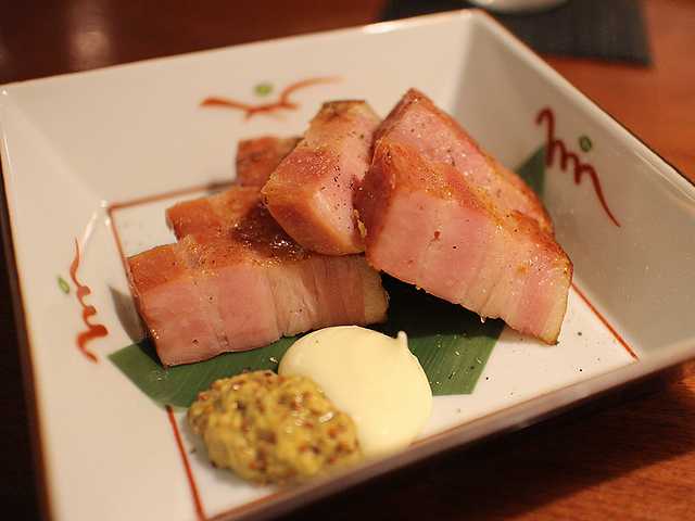 「炙りベーコン(580円)」は味噌漬けされていて、ほんのりと味噌の味がして普通の炙りベーコンとは違っていました。こちらも日本酒に合う肴です。