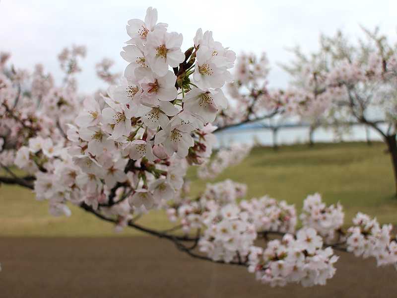 あいにくの曇り空でしたが、今朝8時半ごろの木場潟の桜は3~5分咲き程度でした。