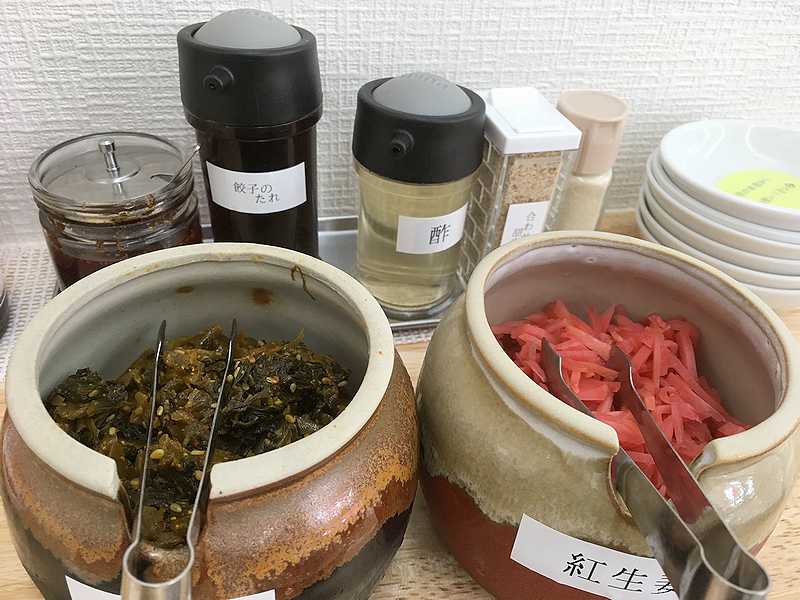 カウンターには、お約束の紅しょうがと辛子高菜が置かれていて、無料で入れ放題。