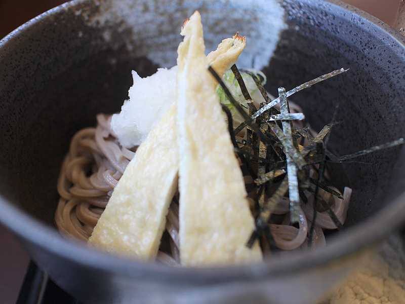 おろしそばには、油揚げが2片乗せられています。そばの量は多くありません。温かいそばも選べますが私は冷たいそばをお願いしました。