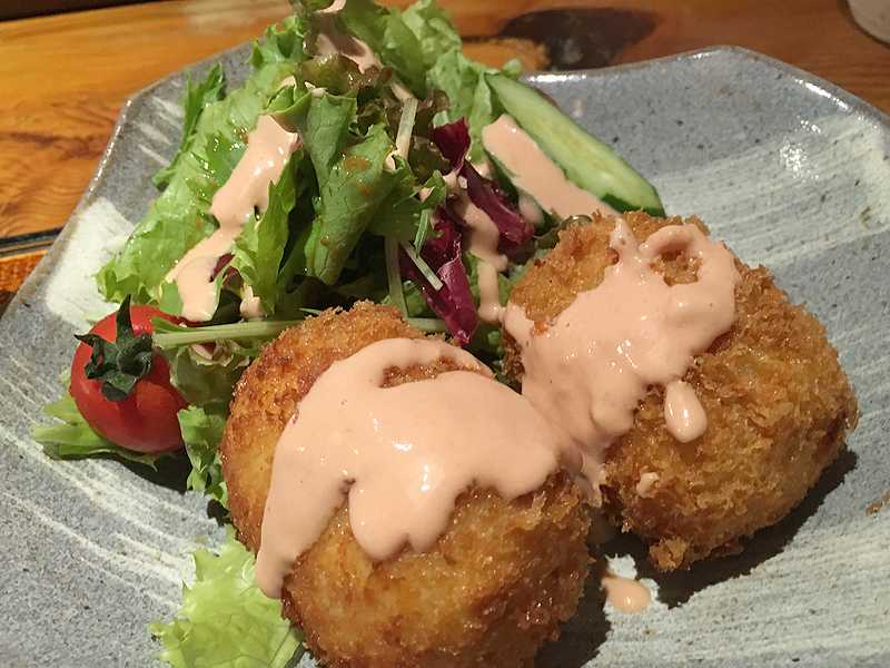 私が頼んだ「よくばり御膳」は週替わりメニューになっていて、この週は、今週の主菜が「ベーコンとチーズのポテトコロッケ たっぷりオーロラソースで」。そして、「本日の小鉢二種」「茶碗蒸し」「炊き込みご飯または白ご飯※この日の炊き込みご飯は高菜漬けとツナの炊き込みごはん」「香物」「味噌汁」という内容です。