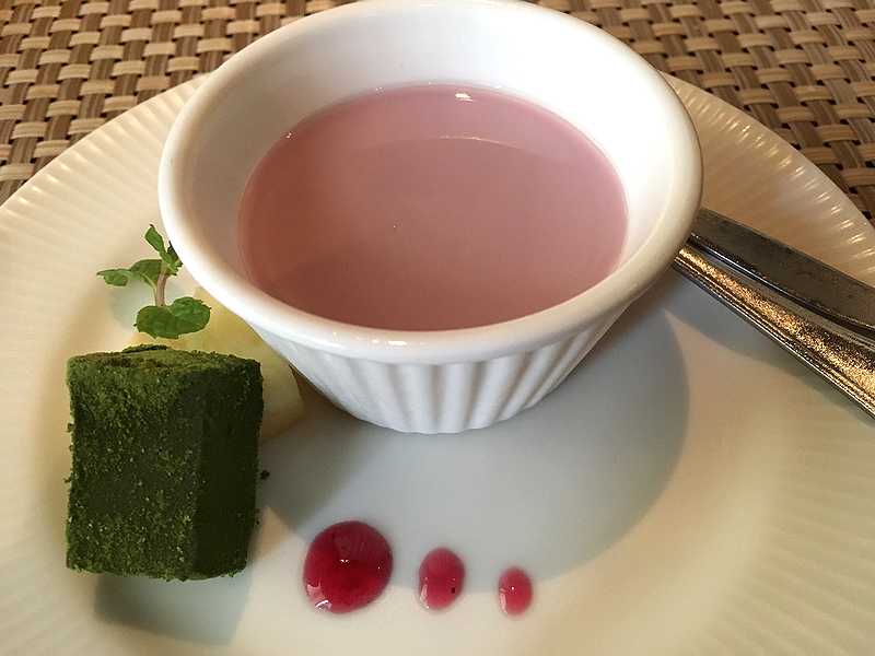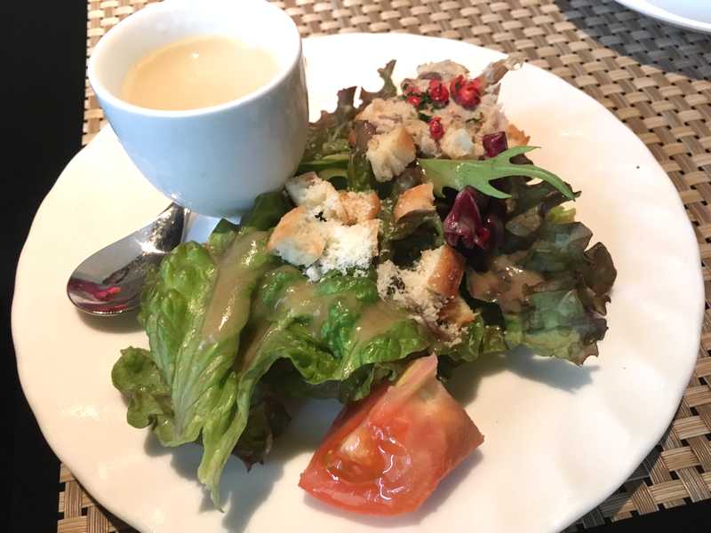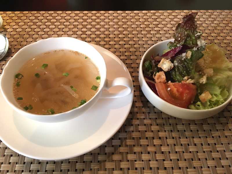 まず、サラダと「西洋ゴボウとキノコのスープ」が出されます。上品なコンソメベースのスープでした。スープは+100円でポタージュに変更が可能です。