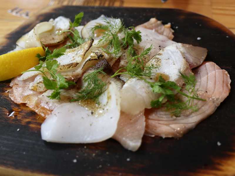 そして「メリメロ」という、フランス語で「ゴチャマゼ」の意味だそうですが、お店のNo.1人気メニュー「メリメロカルパッチョ」の炙り版をオーダーしました。Mサイズで税別1,399円です。