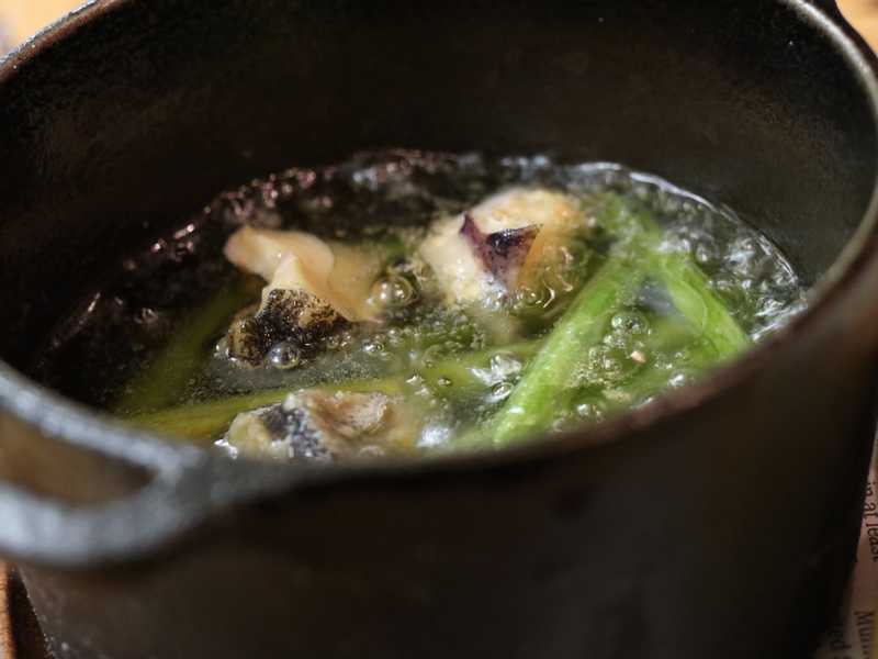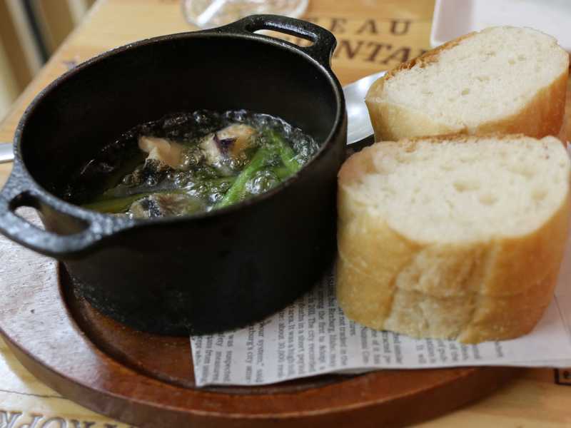 アヒージョは「ツブ貝(税別599円)」。バゲットも付いてきます。