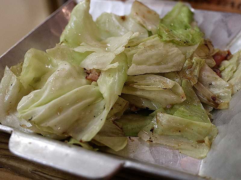 最後は「キャベツとベーコンのアンチョビガーリックソテー(税別499円)」をオーダー。こちらも白ですね。