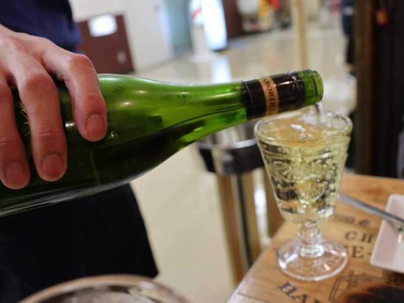 妻のほうはメニューに「NAMIMANIなグラスワイン(590円)」と書かれていた白ワインを頼んでいました。その通り並々と注がれます。