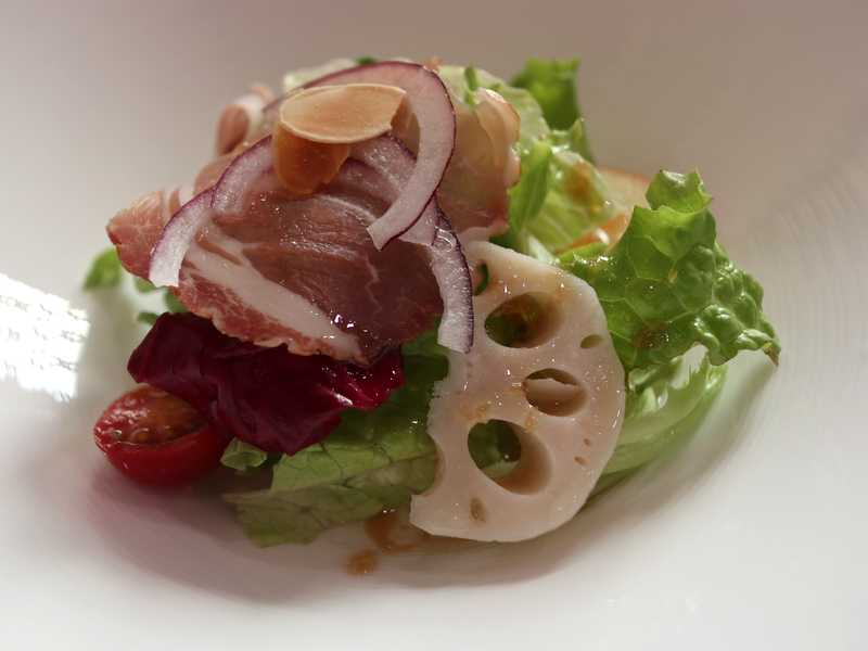 まず出された生ハムサラダ。生ハムはスモークされていました。