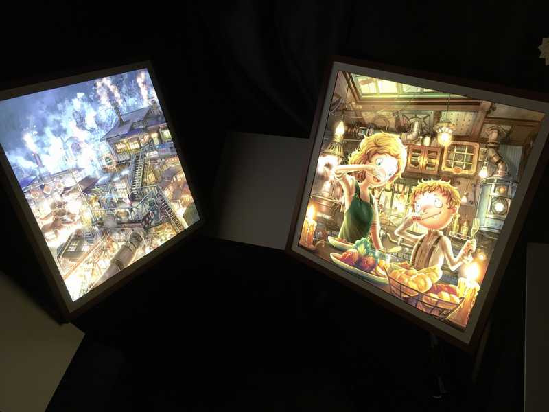 お笑いコンビのキングコングの西野亮廣さんが描いた絵本「えんとつ町のプペル」をテーマに描いた光る絵本展です。