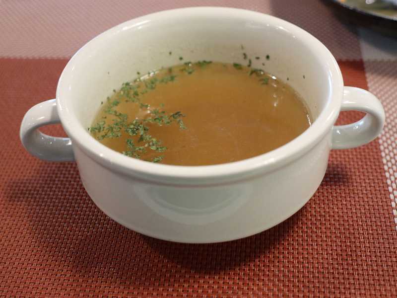 次にスープ。コンソメ味ですが、野菜から採ったダシだけを使用していています。これは何も言われないと肉で作られたコンソメと勘違いするでしょうね?