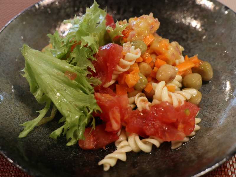 ビンの中には新鮮な野菜や豆、フジッリ(ショートパスタ)がぎっしり。