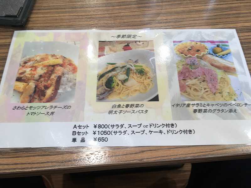 パスタ単品が650円。それにサラダとスープもしくはドリンクが付くランチAセットが800円。スープ・サラダ・ケーキ・ドリンクすべて付くBセットが1,050円となっていました。