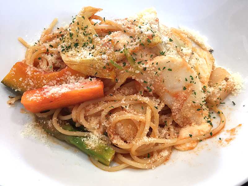 ニンジン・カブ・アスパラ・カボチャ・キャベツなど本当に色々な野菜がたっぷり入っていて、カフェのスパゲッテシらしい味でした。ボリューム的にそこそこの量でした。