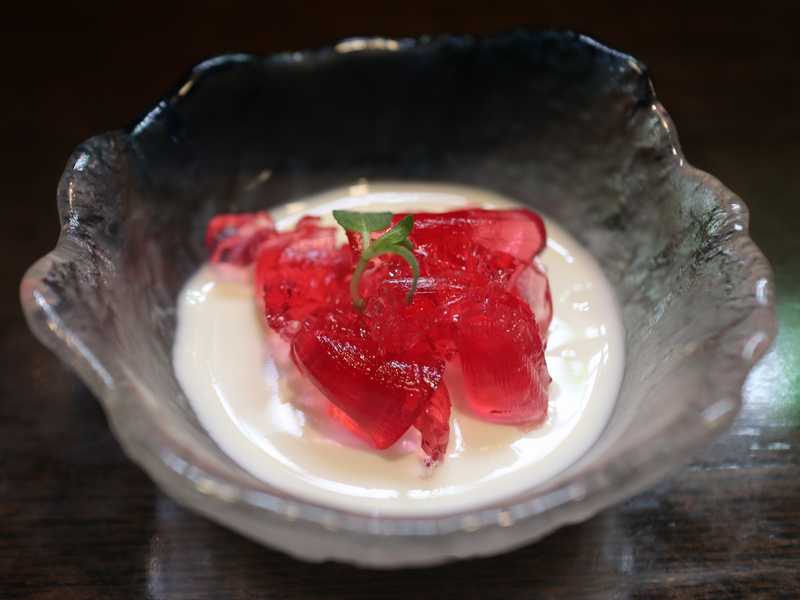 デザートは、パンナコッタの上に赤紫蘇ゼリーが乗せられています。