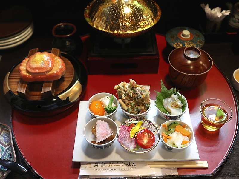 「加賀カニごはん」は、香箱ガニの漁の期間に、加賀の橋立て漁港で水揚げされた小さなサイズのものを冷凍保管して、それを使って禁漁の期間も食べられるコースに仕立てています。1日の提供できる数が決まっていて事前予約が必要です。ちなみにこちらでは限定15食です。