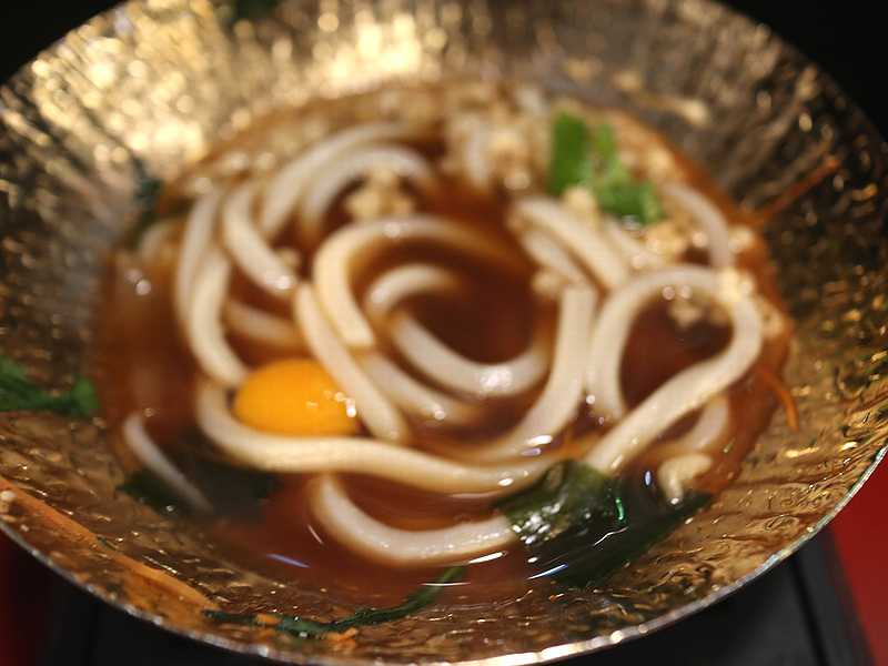 先ほど紹介したすき焼きを一通り食べ終わった後の締めとして、添えられているうどんと、出汁を追加で入れひと煮立ちして食べます。