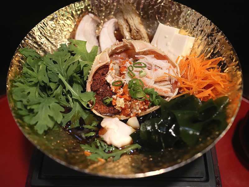 白米ではなく、黒米を野菜と一緒に炊き込んで、自家製のすし酢で作っています。こちらにもカニの身と外子、内子がたっぷり乗せられていました。