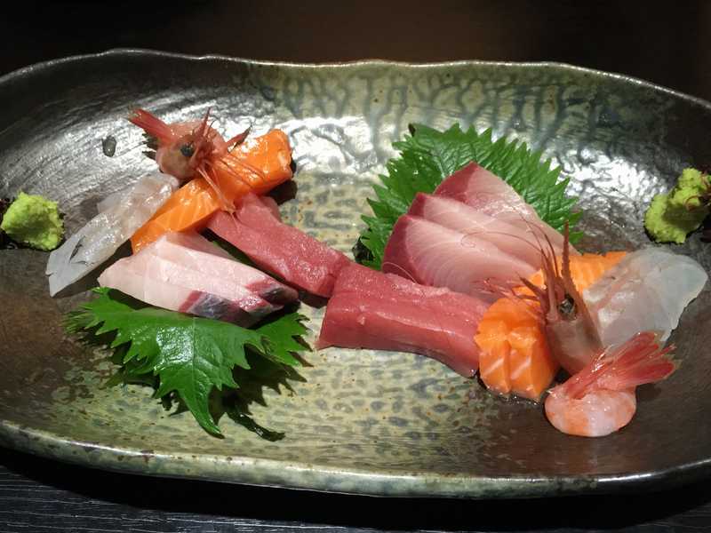 お刺身盛合せは2人前で3,160円。内容はぶり・サーモン・白身・マグロ・甘海老。