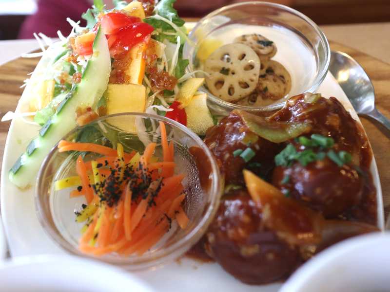 妻のほうはワンプレートのセットランチで、9月から5月限定メニューの「蓮根団子のチリソース」を頼んでいました、