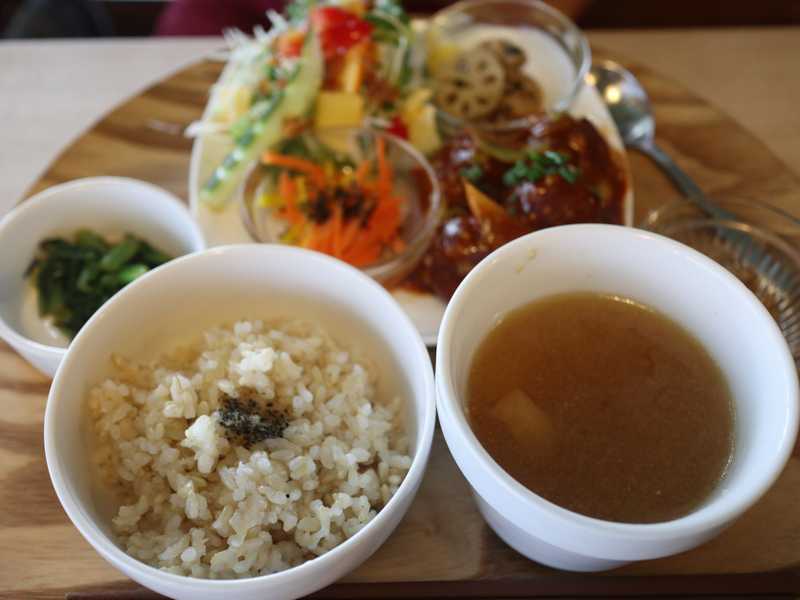 サラダももちろん有機野菜を使っていて、量もたっぷりよかったです。みそ汁は塩分控えめ、みそ汁の具として野菜たっぷり下に沈んでいます。しかし、動物系の素材を出汁で使っていないので、若干うま味が少ないかもしれません。