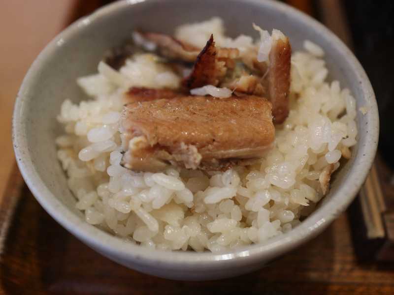 昆布とカツオ節を使った出汁で上品に炊き上がった釜飯。混ぜて小ぶりのお茶碗に盛って食べます。