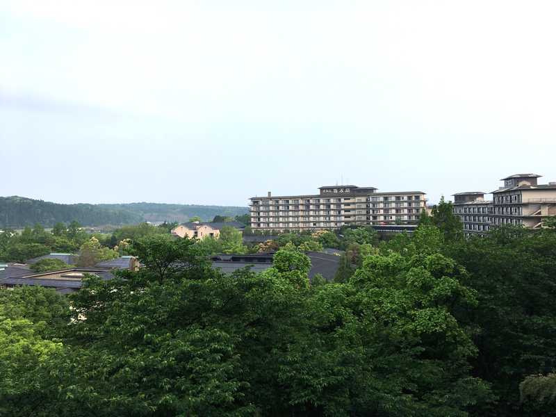 こちらの写真は、近くの温泉旅館「白山菖蒲亭」から閉館中の「ホテル百万石」を見たものです。広大な敷地を誇っていました。