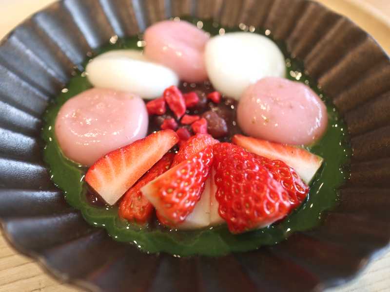 ピンク色の苺の白玉が美味しかったです。ただ抹茶練乳ソースはさすがに甘かったですね。
