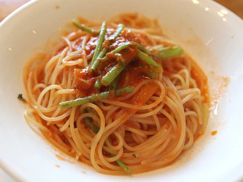 そしてパスタかスープで私はパスタをチョイス。この日は「カタハとベーコンのトマトスパゲッティ」でした。