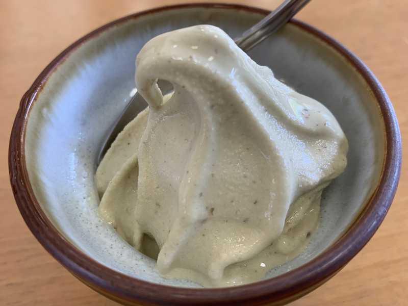 この定食には、豆乳が付くはずなのですが、この日はあいにく入荷がなかったのか品切れで、代わりに小さなそばソフトクリームが出されました。