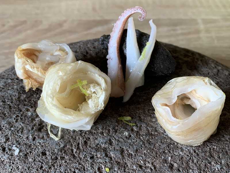 まずは、メニューには「赤烏賊 背脂 おぼろ昆布」とだけ書かれていますが、イタリアのラルドという背脂をまとわせたものや、七尾の老舗乾物屋さんのおぼろ昆布をまとわせたものなど、さりげなく地元やイタリアの食材との融合を感じさせてくれる一品です。