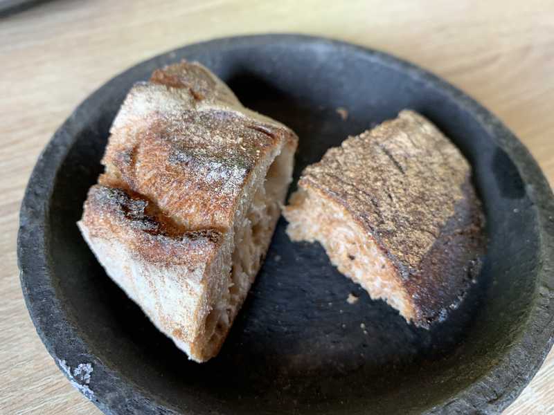 レーズン酵母と小麦全粒粉でつないだ自家製酵母を使用していて、全粒粉の小麦そのものの美味しさを舌で感じることが出来るパンです。なお、写真を写す前にコンプレの方、半分ほど食べてしまっています。^^;