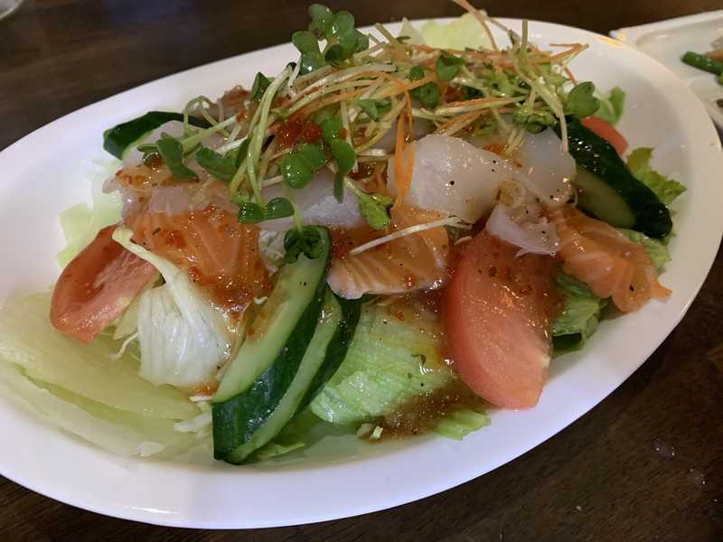 こちらは「めんそーれサラダ(900円)」。刺身が散りばめられたサラダです。