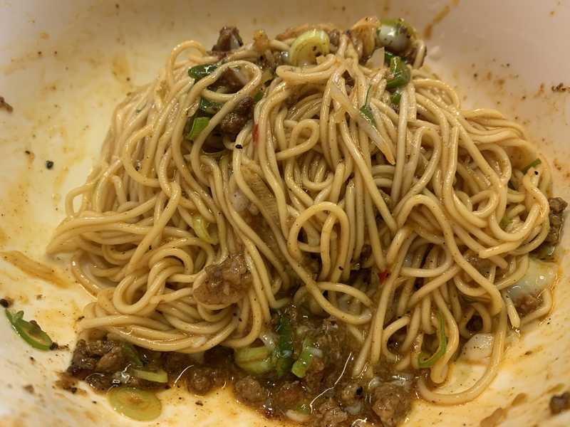 麺の下にお店独自のタレを敷き、湯掻いた麺を乗せ、その上に具材の青ネギと味が付けられたそぼろ肉を乗せてあるものです。