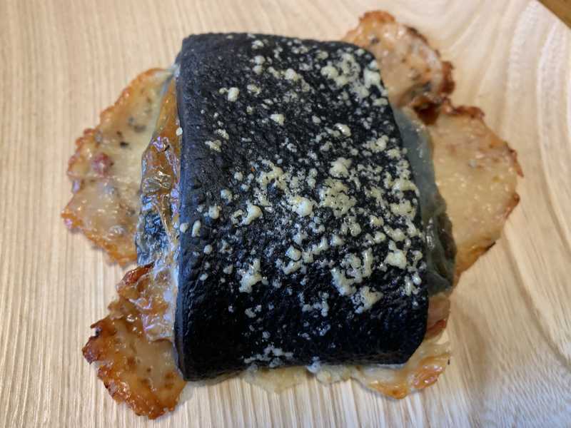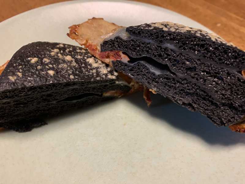 切ってみるとこんな感じ。素材はイカスミ・トマト・モッツアレラ。いわゆるイカスミパンですが、イカスミの風味がそれほどするわけではなかったです。でも美味しくて濃い味の個性的なパンでした。