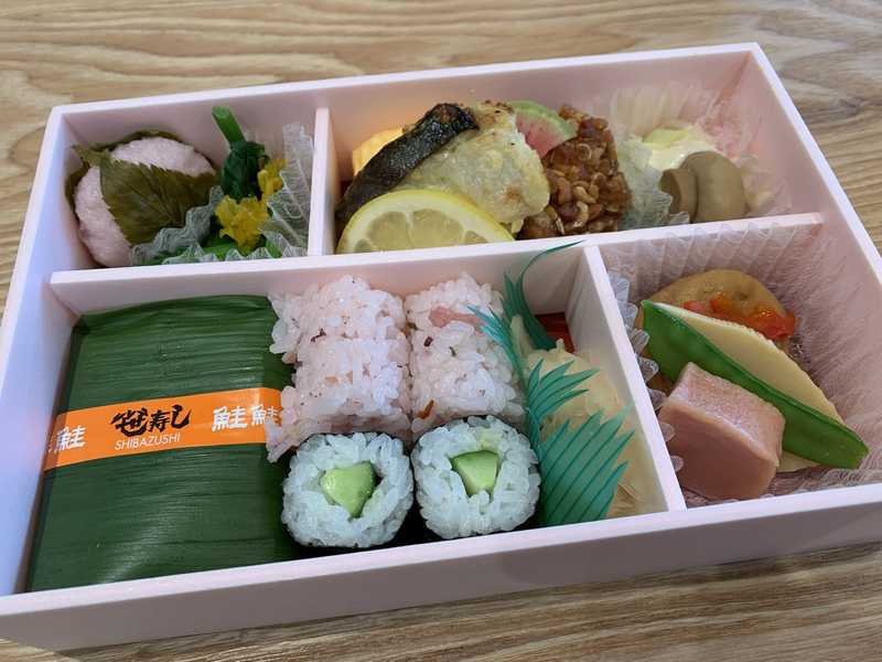 定番の笹寿しはもちろん、さくらご飯や桜餅など入った、いわゆる花見弁当です。桜の下で食べるとまた格別でしょうが、今の時期、そうもいきませんね。