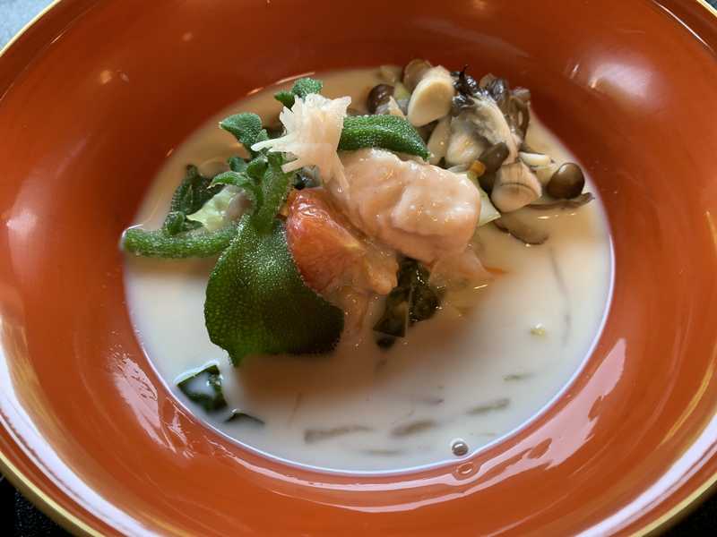 そして鮭とタラを合わせて、豆乳と生姜仕立ての汁で仕上げてあります。上品ながら色々な食材の滋味がにじみ出ていて美味しいです。