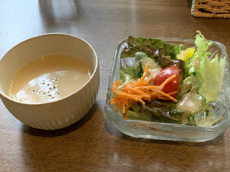 まずはサラダと季節のスープが出されます。サラダは妻の方にだけ付いているものです。