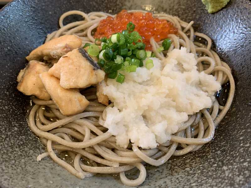 私は「鮭とイクラのおろしそば(税込1,480円)」を頼むことに。おろしは普通と辛味大根が選べて、私は辛味でお願いしました。