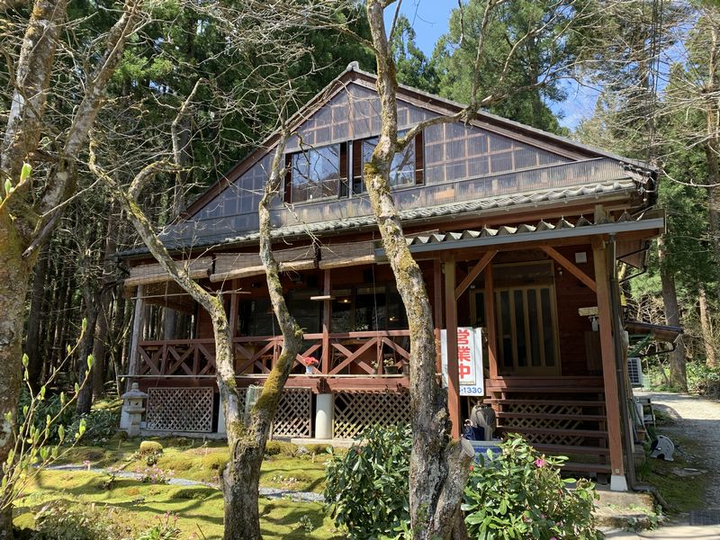 お店はログハウス作りで、お店の前に小さな池があります。