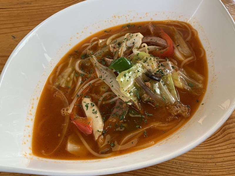 最初にスープを一口。確かに辛いです。でも野菜やハーブソーセージなど具がたっぷりで、麺は普通の乾麺を使われているようでしたがアルデンテで、スープと合わせて美味しかったです。