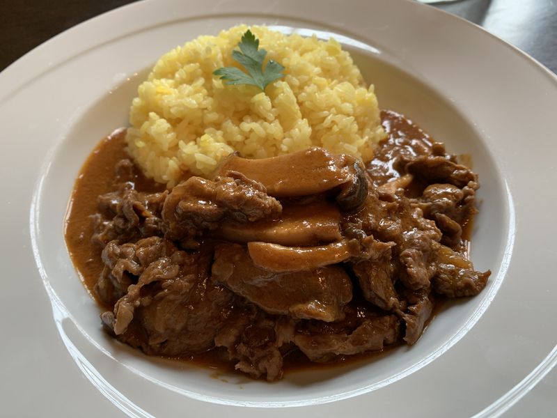 牛肉・玉ねぎ・キノコがたっぷり入っているストロガノフで、ブイヨンやスープなどで煮込んでサワークリームを加えて仕上げてあります。こちらもターメリックライスでした。