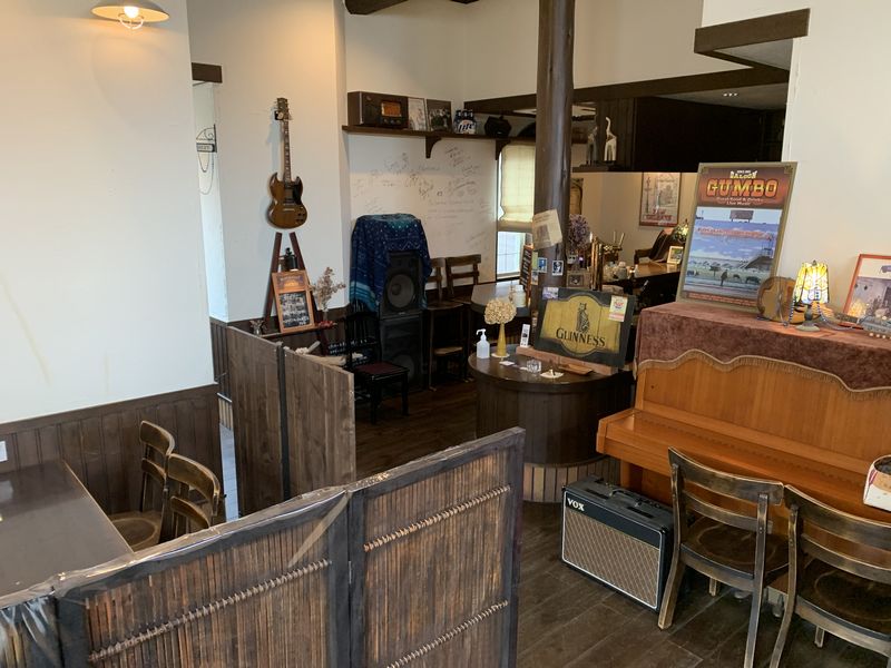 店内に入るとピアノやギターなどの楽器、大きなスピーカーが置かれていてライブハウスのような感じでですが、お聞きすると今はライブはやっていないようです。