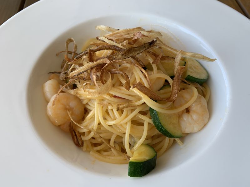 メインのパスタは私は「小海老とズッキーニのペペロンチーノ ごぼうのフリット添え」。