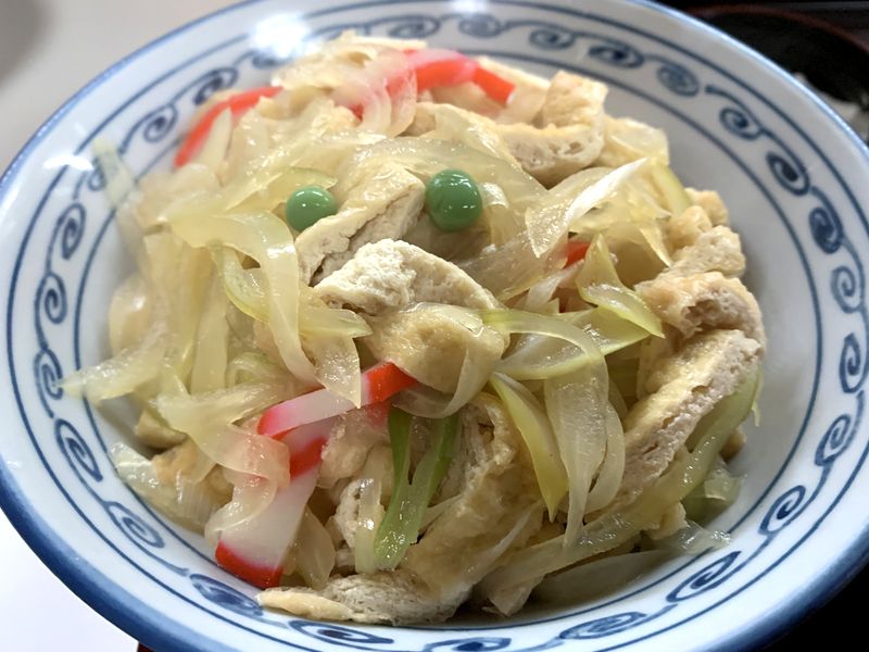 「いなり丼」のほうは、玉ねぎと揚げがたっぷりで、他に赤巻きと長ネギ、グリーンピースが2個?