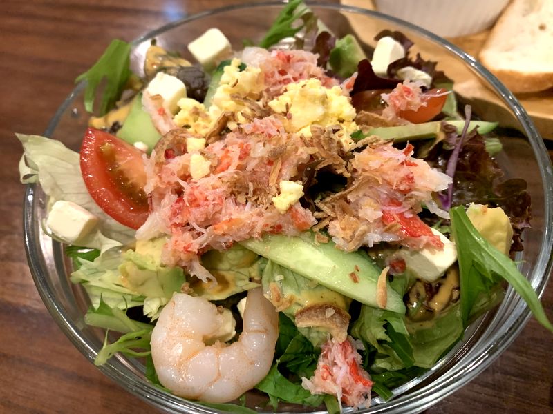 エビ・カニ・アボカド・クリームチーズなど具の種類も色々のサラダでした。