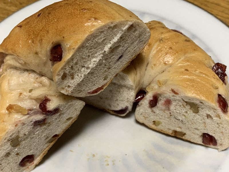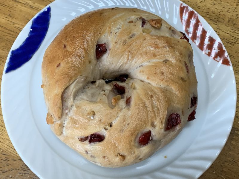 名前の通りクランベリーとくるみが入っていて、ベーグルらしいモチっとした食感。小麦の風味とクランベリーの甘酸っぱさがいいハーモニーでした。