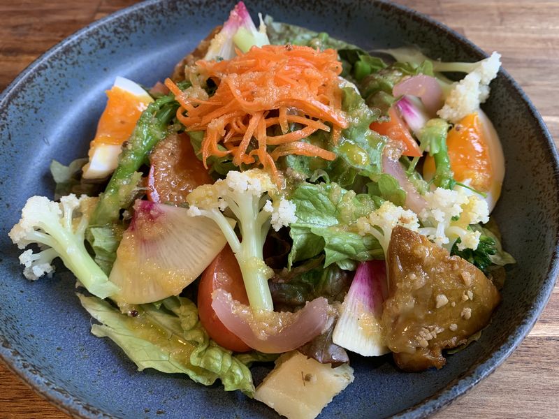 あと、こちらの「具沢山サラダS(500円)」を頼んでいます。地元産野菜中心だそうで、確かに色々な種類の野菜が入っていてドレッシングが美味しくてよかったです。