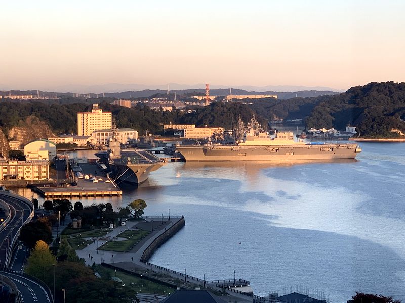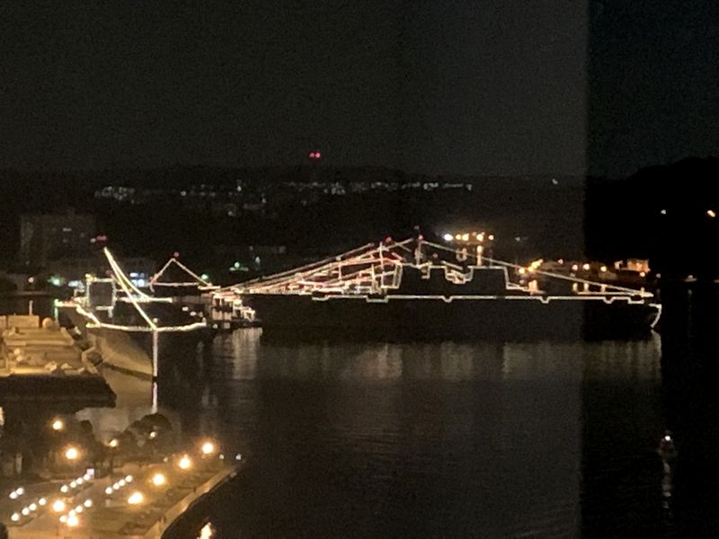 ちょうど国際観艦式が行われる前だったので、多くの艦船が停泊していて、夜には海上自衛隊の巨大なヘリコプター搭載護衛艦の照明が点灯。夜景的にもよかったです。