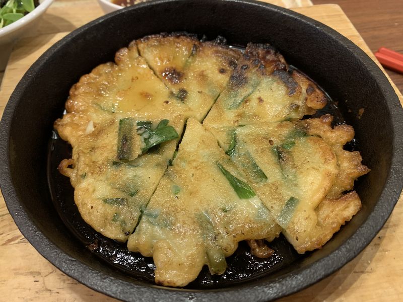 ハーフ白胡麻担々麺または汁なし担々麺に鉄板にらチヂミとチョレギサラダが付いているセットでした。