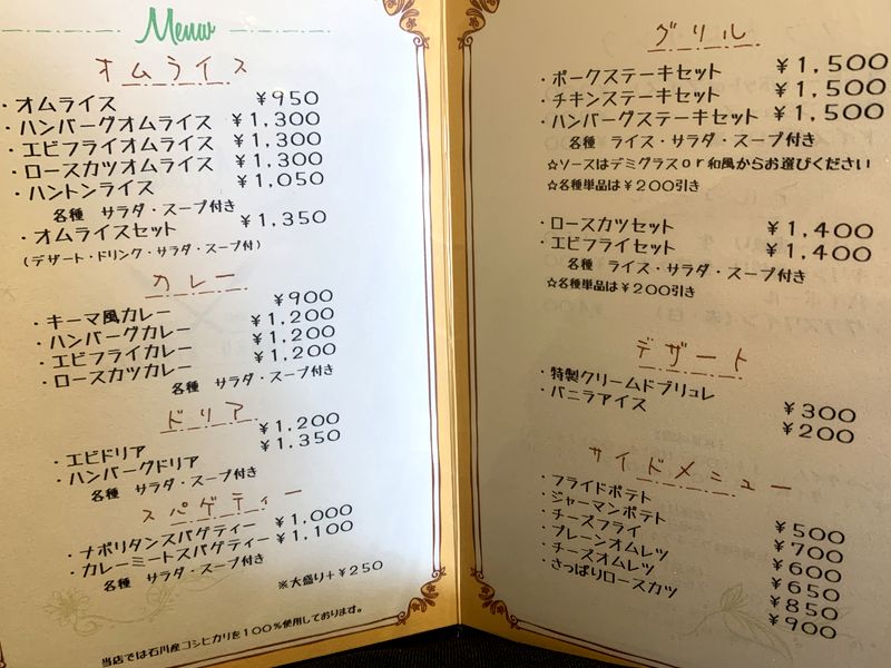 これは店内に置かれていたメニューです。ザ・洋食の品揃えです。